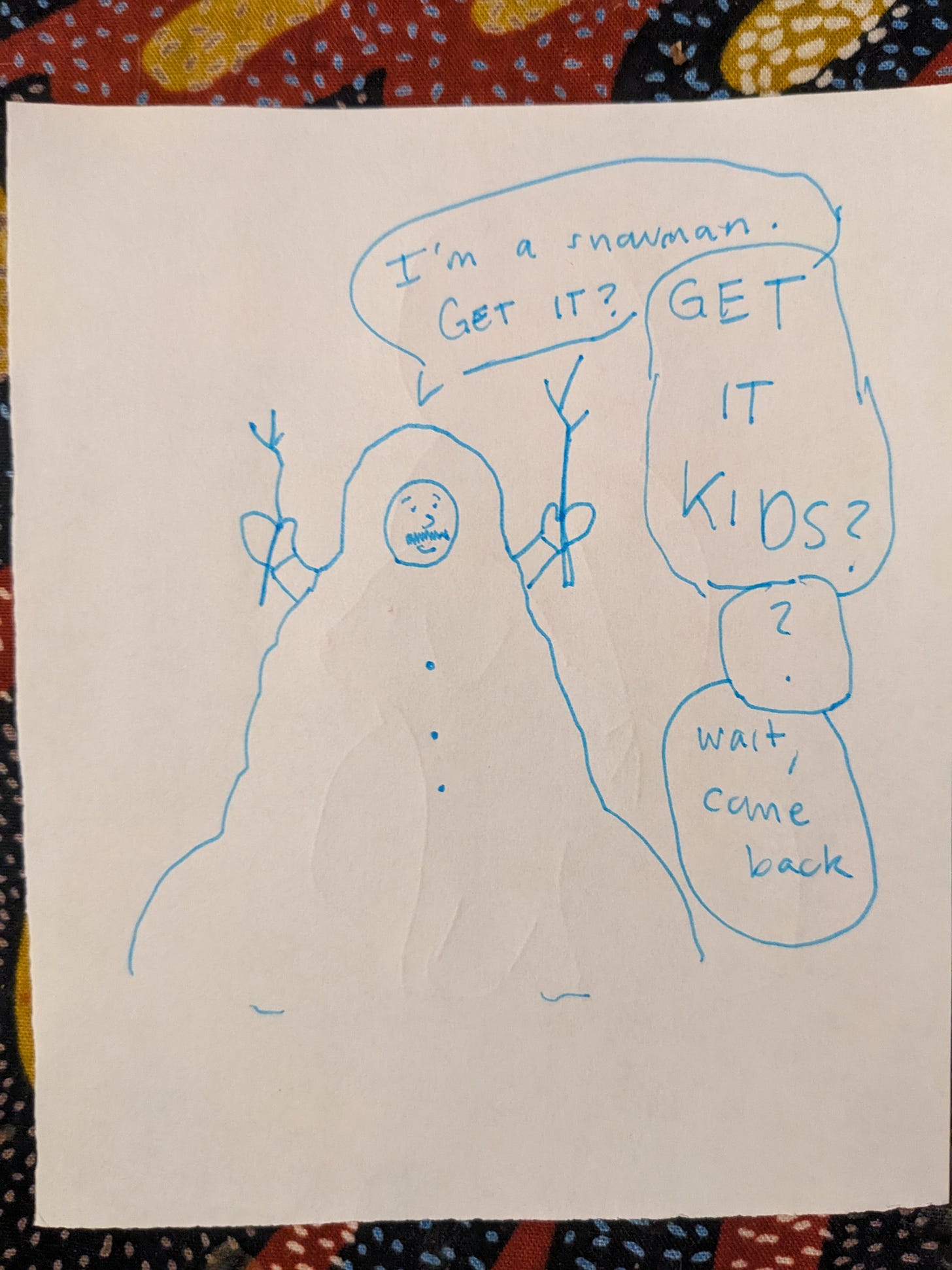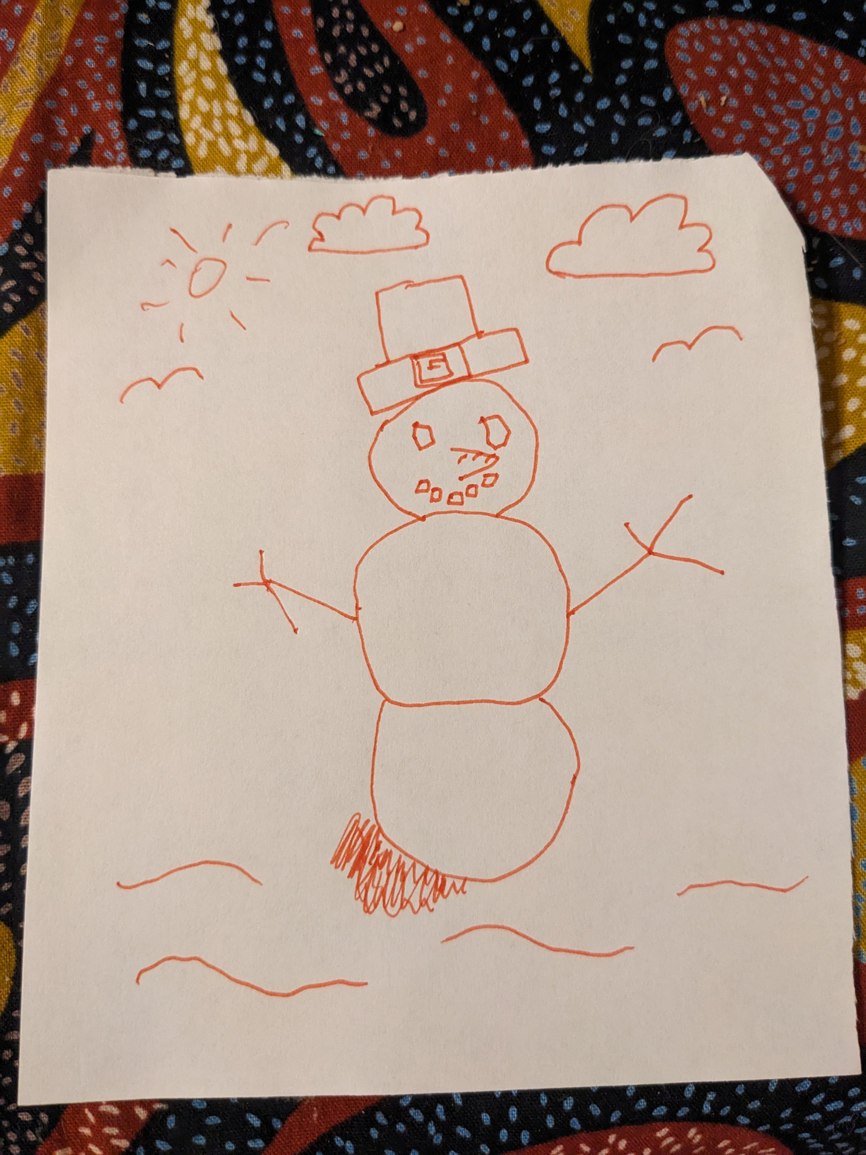 And finally: tonight’s challenge. A snowman. Here is Ben’s. Classic, with a shadow at the bottom.